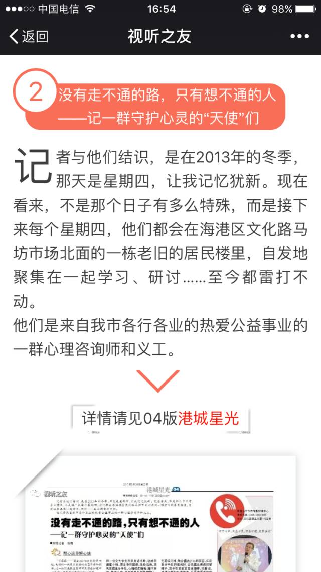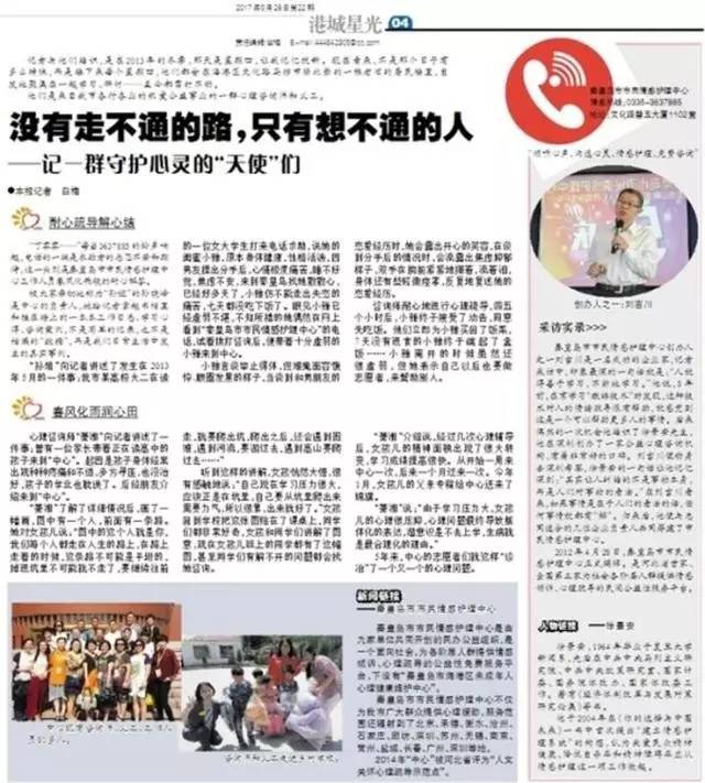 2017年5月26日,第22期《視聽之友》第四版“港城星光”欄目記者白梅的一篇《沒有走不通的路,只有想不通的人》,再次報道了秦皇島市市民情感護理中心的事跡和由來。