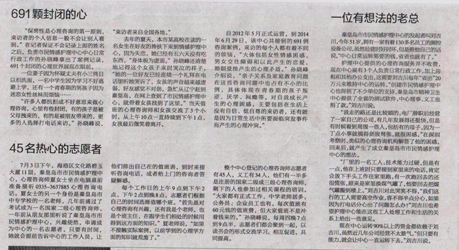 總經理劉吉川先生的這一善行,受到了社會各界的廣泛關注,燕趙都市報、秦皇島晚報等各大媒體先后進行了采訪和報道。這也使得秦皇島市市民情感護理中心更廣泛的為人所知,從而能夠給廣大民眾提供更多的幫助,更好地服務于人民、服務于社會,最終為打造積極生態圈、構建和諧社會、實現偉大的中國夢貢獻力量!