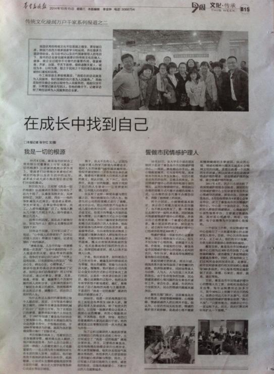 摘自《秦皇島晚報》(2014年10月15日,B15版):情感護理是一項新型的心靈慈善事業,其以心理咨詢方式切入,但又不僅僅限于心理咨詢,更側重于人生觀、價值觀、幸福觀的引導。秦皇島市市民情感護理中心的創始人名叫劉吉川,今年51歲,秦皇島華電測控設備有限公司總經理。