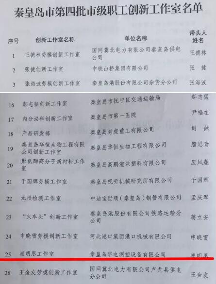 秦皇島華電測控設備有限公司“崔明思工作室”被秦皇島市勞動競賽委員會命名為第四批市級職工創新工作室。