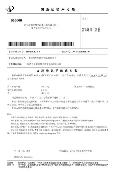 公司于2017年2月14日提交的“一種槽式太陽能聚光器鏡面的設計方法”(專利號:201710078246.4)專利已被中華人民共和國國家知識產權局授予發(fā)明專利權。此項專利的授權,標志著公司已經擁有43項自主知識產權。