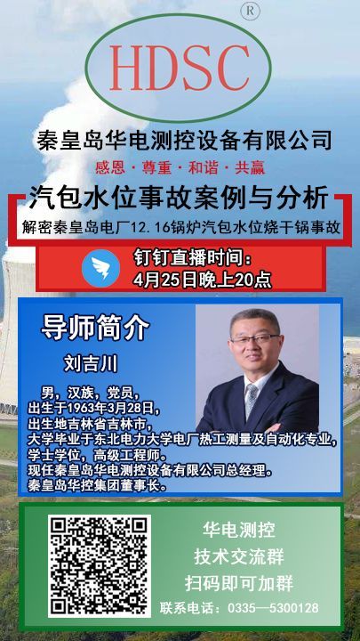 2020年4月25日晚8時,秦皇島華控集團有限公司董事長劉吉川先生攜手【熱控圈】舉辦“火力發電廠鍋爐汽包水位測量系統系列講座之解密秦皇島電廠12.16鍋爐汽包燒干鍋事故”。“千聊”、“抖音”、“釘釘”軟件同步直播。