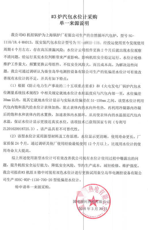 該電廠擁有3臺300MW火力發電機組,2005年投產運行。由于汽包水位測量系統測量偏差較大,存在了嚴重的安全隱患。在2018年采用了我公司的專利產品高精度云母水位計后,解決了原有水位測量不準確的問題,為日后的安全運行工作帶來了保障。