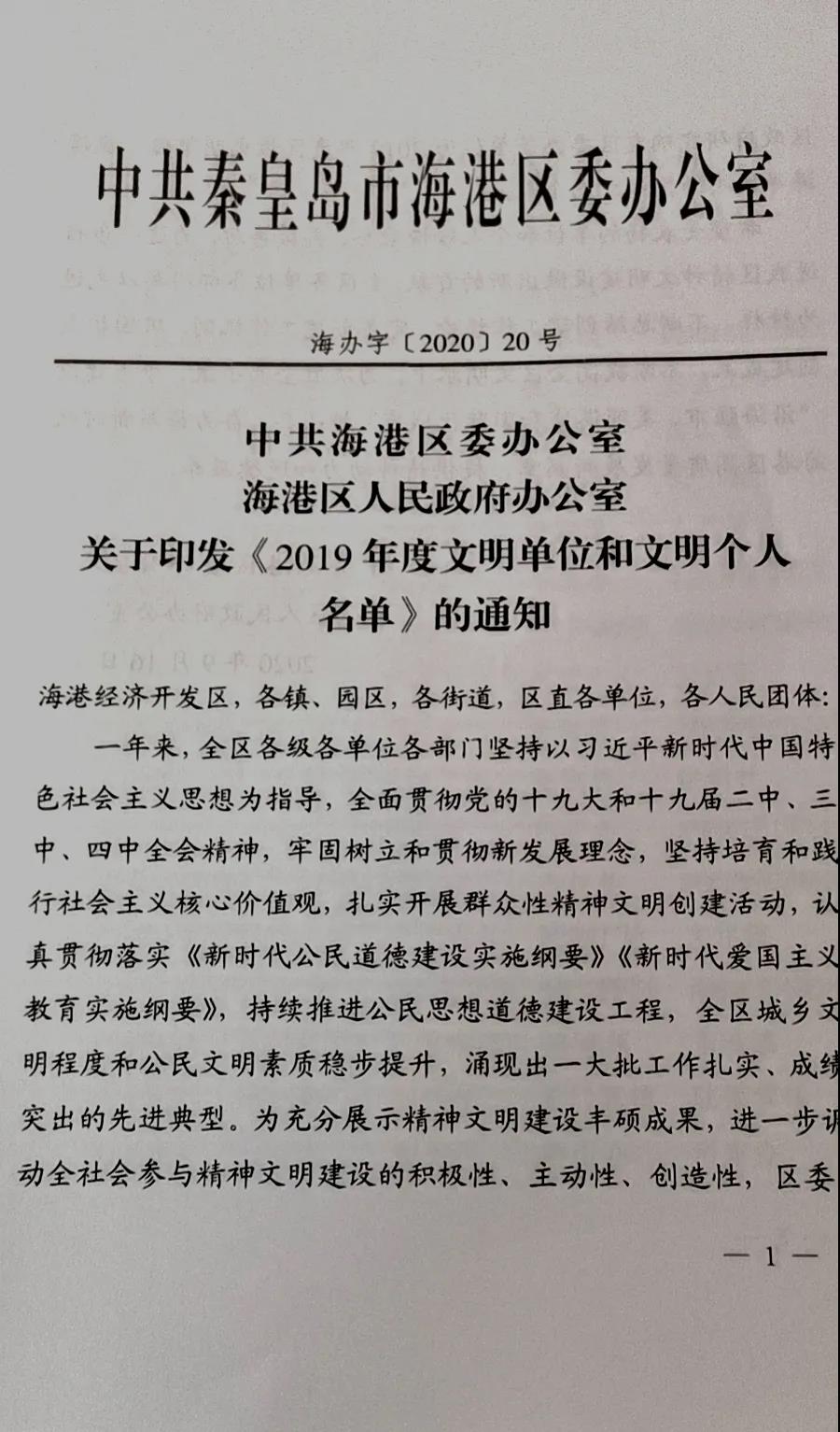 2020年4月,中共秦皇島市海港區委、區政府組織申報2019年度文明單位和文明個人,經過推薦評審,近日獲悉華電測控榮獲文明單位稱號。