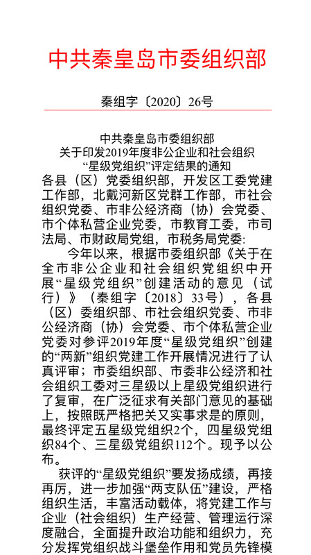 2020年,中共秦皇島華電測控設備有限公司支部委員會通過自下而上的方式申報至上級街道黨工委,上級黨工委指派專人到基層組織進行測評、考評,經黨委會議評定并公示后確定評星等級,授星,我公司支部委員會被評定為四星級黨組織。