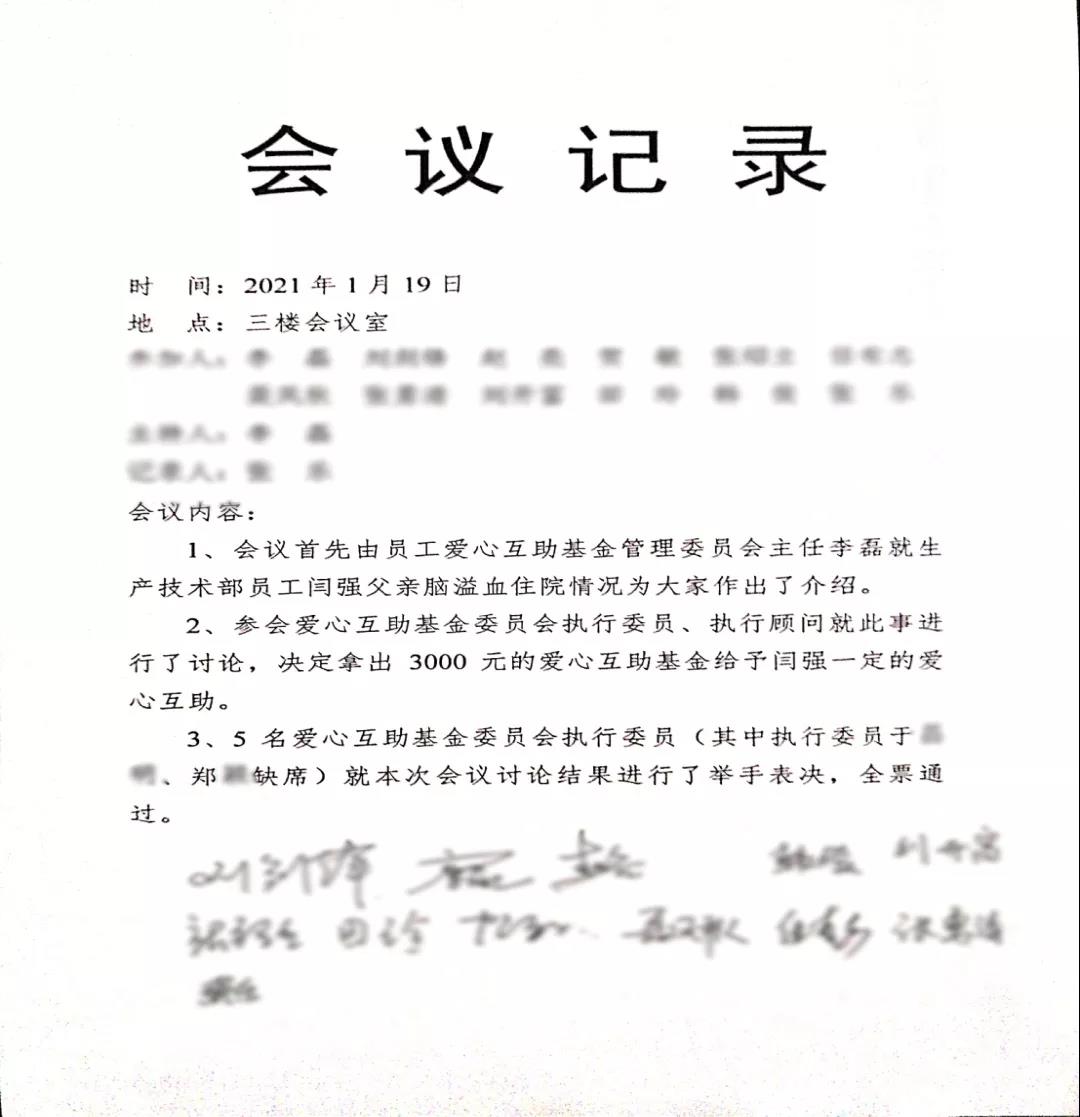 1月19日,當公司領導得知生產技術部員工閆強父親因腦溢血而住院的情況后,組織召開了員工愛心互助基金會議,會上經過集體討論,基金決定拿出3000元款項給予一定的愛心互助。