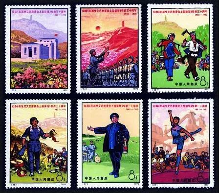 1972年5月23日發(fā)行的編號郵票33-38 紀念《在延安文藝座談會上的講話》發(fā)表三十周年,共6枚。編號郵票33,面值8分,圖案為“座談會會址”。編號郵票34,面值8分,圖案為“高唱革命歌曲”。編號郵票35,面值8分,圖案為“街頭劇《兄妹開荒》”。編號郵票36,面值8分,圖案為“文藝工作者深入工農(nóng)兵,邊勞動、邊宣傳”。這4枚反映的都是中華人民共和國建國前的情景, 故均以延安寶塔山作為背景。編號郵票37,面值8分,圖案為“為農(nóng)民演出”。編號郵票38,面值8分,圖案為“為工人演出”;這2枚中的人物是現(xiàn)代京劇《紅燈記》中的李玉和與芭蕾舞劇《紅色娘子軍》中的吳瓊花。