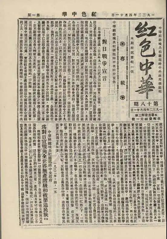 中華蘇維埃共和國臨時中央政府宣布對日戰(zhàn)爭宣言。