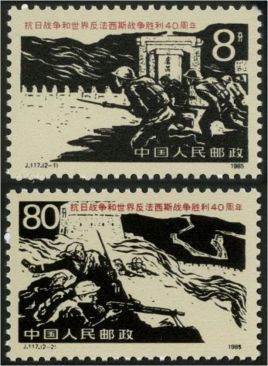 第三枚,七七戰火。1995年9月3日發行了《抗日戰爭及世界反法西斯戰爭勝利50周年》紀念郵票的首枚,這枚影寫版郵票長40毫米,寬30毫米,面值10分,何潔、陳楠、馮小紅聯合設計。郵票主圖以黑白照片資料取舍加工,以靜態為主,定格了中國守軍的盧溝橋頭嚴陣以待、抗擊日寇的歷史場面。