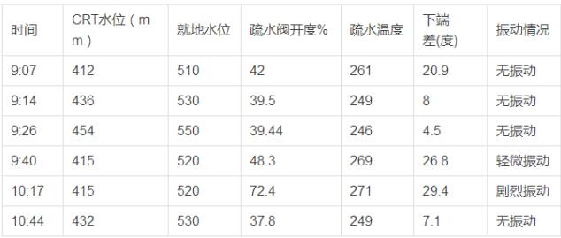 1號機(jī)組大修后,發(fā)現(xiàn)1號高加至2號高加疏水管道發(fā)生明顯晃動(dòng),為了徹底查詢管道振動(dòng)的原因,采取有效解決措施,進(jìn)行1號高加水位變動(dòng)試驗(yàn)。數(shù)據(jù)如下表: