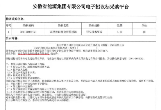 2022年3月18日,安徽某發(fā)電公司“電接點(diǎn)水位計(jì)改造項(xiàng)目”招標(biāo)結(jié)果公示,秦皇島華電測(cè)控設(shè)備有限公司被評(píng)選為中標(biāo)單位。中標(biāo)產(chǎn)品“高精度取樣電極傳感器”,數(shù)量4套,本月底前我公司將完成施工改造。