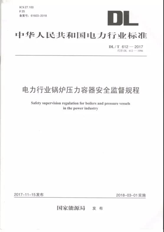 中華人民共和國(guó)電力行業(yè)標(biāo)準(zhǔn)DL/T 612-2017《電力行業(yè)鍋爐壓力容器安全監(jiān)督規(guī)程》(替代DL612-1996)于2017年11月15日由國(guó)家能源局發(fā)布,并于2018年3月1日實(shí)施。此規(guī)程規(guī)定了電力行業(yè)鍋爐壓力容器安全監(jiān)督要求,并在“10.安全保護(hù)裝置及儀表中10.3水位測(cè)量系統(tǒng)”引用了《火力發(fā)電廠鍋爐汽包水位測(cè)量系統(tǒng)技術(shù)規(guī)程》(DL/T1393-2014)部分內(nèi)容進(jìn)行系統(tǒng)闡述。