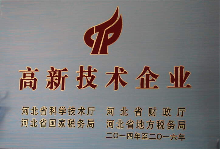 2014年9月19日,公司被河北省科學技術廳、河北省財政廳、河北省國家稅務局、河北省地方稅務局認定為河北省高新技術企業,證書編號:GR201413000387,近日頒發了證書和牌匾。