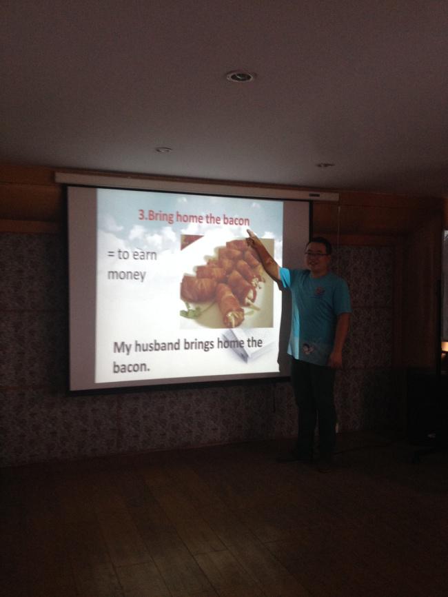 第一個環節大家學習了“與食物有關的俗語”。通過觀看大屏幕上吸引人的照片,他們學習了十個與食物有關的英語俗語。比如piece of cake(容易的事情), to go bananas(變瘋狂了), bring home the bacon(賺錢), have bigger fish to fry(有更重要的事情要做),like two peas in a pod(很相似), eat like a horse(很能吃), as red as a cherry(非常紅)……下一個環節是口語學習。這次他們學習了如何表達“感謝”和“對不起”以及如何回答別人的感謝和抱歉。在英語中我們有時可能會混淆回答“謝謝”和“對不起”的答語。在這個環節過后,大家對他們的區別有了更深的了解。最后他們做了一個簡單的測驗,檢驗一下他們是否在英語角有所收獲。